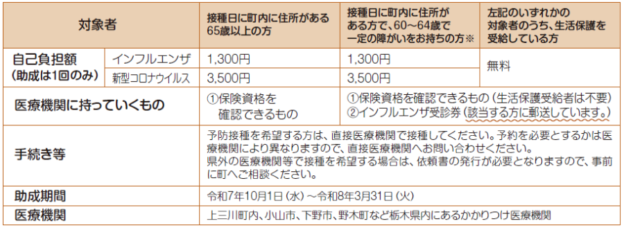 町では、接種を希望する下表の方に、接種費用の助成を行っています。