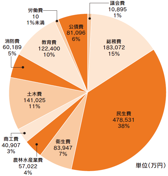目的別に見ると、民生費の割合が最も高く、令和5年度と比較して、2億1,202万円の増となりました。令和6年度から始まった物価高騰対応定額減税補足給付金事業が増加の主な要因です。なお、社会保障施策の充実により子ども・子育て支援費や障害者自立支援給付事業などが増加傾向となっています。
