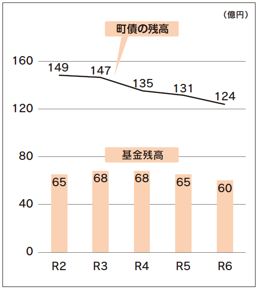 基金とは、様々な目的のために積み立てているものです。一般会計と特別会計を合わせた町全体の令和6年度末残高は、59億7,252万円となりました。主なものとして、歳出に対する不足額を補うため、財政調整基金を取り崩しました。