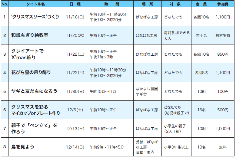 イベント とちぎわんぱく公園イベント情報 17/43 前の記事 次の記事 発行日 : 2025年11月01日 自治体名 : 栃木県壬生町 広報紙名 : 広報みぶ 2025年11月号 ※各イベントの申込期間・方法については、とちぎわんぱく公園ウェブサイトを確認してください 問合せ:とちぎわんぱく公園管理事務所 【電話】86-5855 Tweet シェアする 2025おもちゃ団地チャリティーバザール 議会事務局からのおしらせ