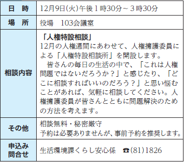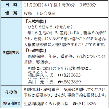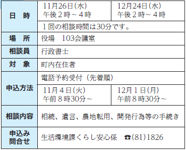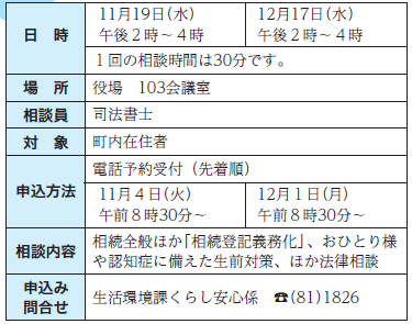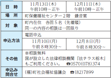 内容:面談による法律(債務整理)相談および心の健康相談(定員4名)