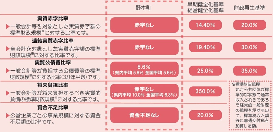 財政指標は基準を下回りましたが、今後持続可能な財政構造の確立を図るために、この指標を分析し、町にとって必要な行政サービスを十分に考慮しながら、行政改革に取り組んでいきます。