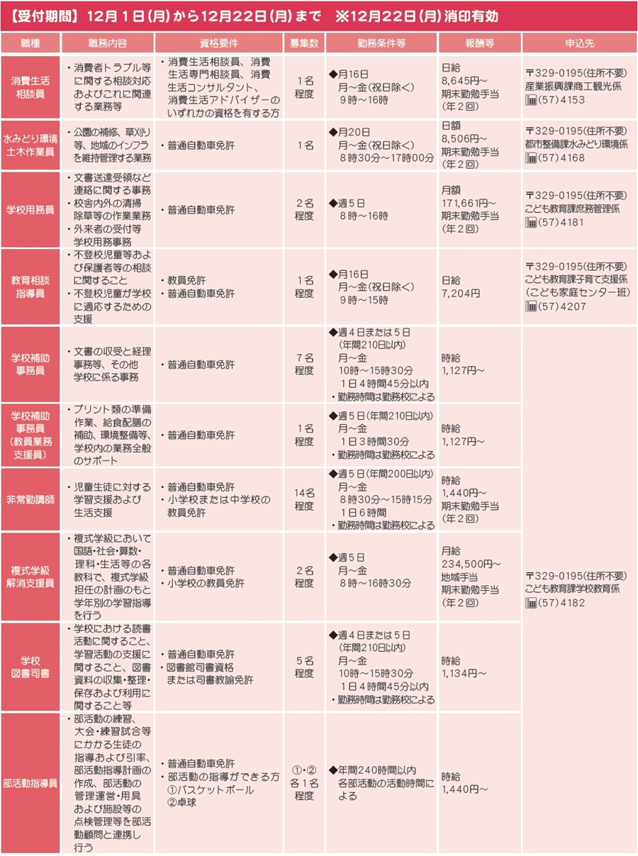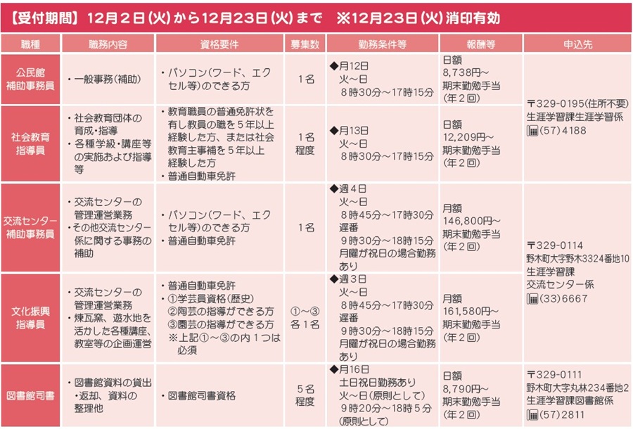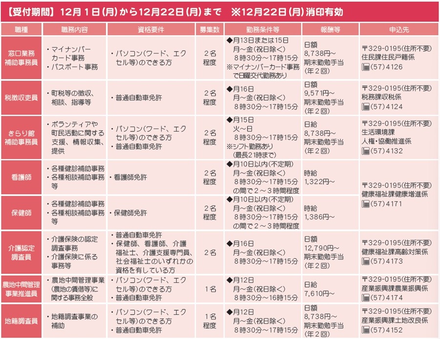 申込方法:履歴書(写真貼付)に氏名、生年月日、住所、連絡先電話番号、学歴、職歴、免許、資格、希望職種、希望理由をご記入の上、直接または郵送でお申込みください。(直接の場合、申込先の開庁時間にお持ちください。)