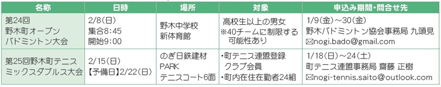 スポーツ スポーツ教室・大会のお知らせ 31/38 前の記事 次の記事 発行日 : 2026年01月01日 自治体名 : 栃木県野木町 広報紙名 : 広報のぎ 2026年1月号 各教室・大会の詳細は、町HPをご覧ください。 Tweet シェアする 野木町公式LINEのリニューアルおよびセグメント配信運用開始! 野木町スポーツ推進委員を募集します