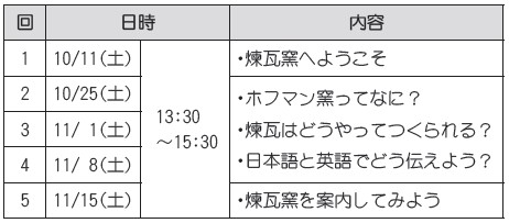 煉瓦窯のしくみや英語表現のエッセンスなど、案内の基本とコツを学びます。中学生・高校生の皆さんの受講も大歓迎です。