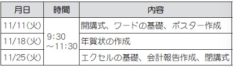 ワードで年賀状・ポスターの作成、エクセルで会計報告作成など学習しますのでぜひご参加ください。