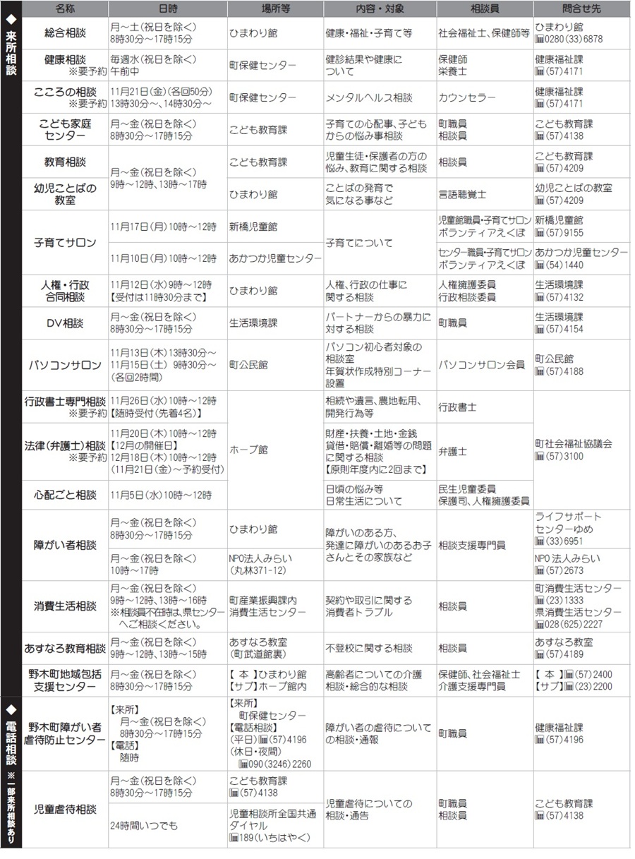くらし 相談コーナー 24/42 前の記事 次の記事 発行日 : 2025年11月01日 自治体名 : 栃木県野木町 広報紙名 : 広報のぎ 2025年11月号 その他の相談機関については、町HPをご覧ください。 Tweet シェアする こどもひろば(3) 関東どまんなかサミット情報