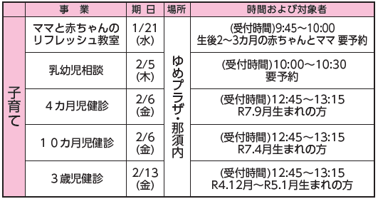 1歳6カ月児健診、2歳児歯科検診は「広報那須2月号」でお知らせいたします。