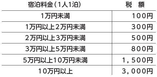 宿泊料金に応じた、右表の税額を宿泊施設等にお支払いいただきます。