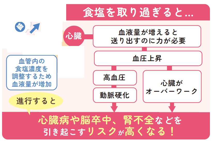 塩分(食塩)の取り過ぎは高血圧の原因となり、脳卒中などの脳血管疾患や心不全・腎臓病をはじめとする重病を引き起こすリスクを高めてしまいます。
