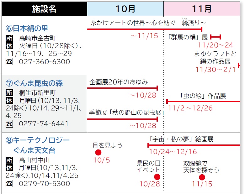 県有施設や、市町村・民間施設では「群馬県民の日」を記念して、県内外各地で施設の無料(割引)開放、イベント、プレゼント配布が行われます。記念事業の一覧はホームページをご覧ください