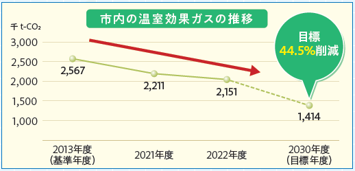 「2050年ゼロカーボンシティまえばし」の実現に向けて、2030年度には2013年度比でCO2排出量44.5%の削減を目標に掲げています。市内の排出量は少しずつ減少しているものの、目標達成に向けては、さらなる取り組みの加速が求められます。