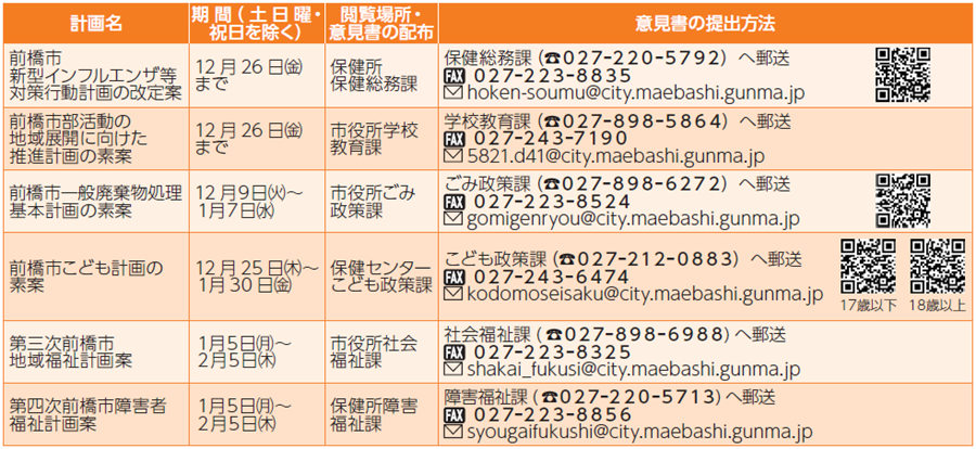 下表のとおり、本市の計画案についてパブリックコメント(意見募集)を実施。寄せられた意見は本市の考え方と併せて各閲覧場所で公表します。閲覧と意見書の配布は情報公開コーナー、各支所・市民サービスセンター・公民館・コミュニティセンターでも実施。本市ホームページにも掲載します。意見書は所定の用紙に記入し、各閲覧場所へ直接提出するほか、各課に郵送やファクス、メールなどでも提出できます。