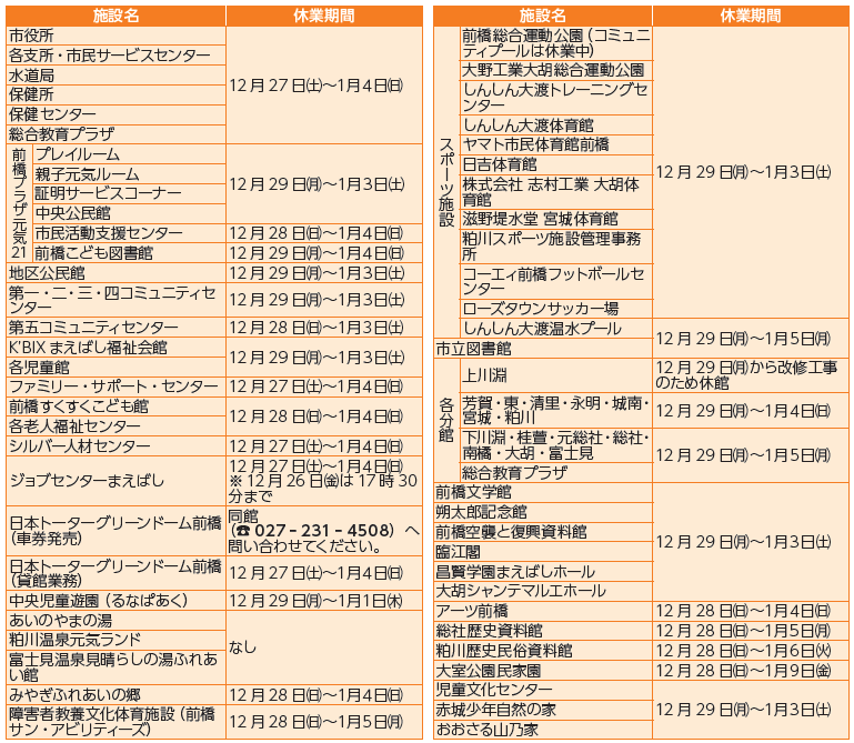 年末の市役所や各支所・市民サービスセンターの業務は12月26日(金)まで。年始は1月5日(月)から平常どおり業務をします。主な施設の休業日は下表のとおりです。