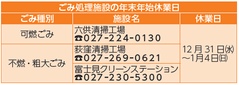 年末年始のごみ処理施設の休業期間は下表のとおりです。12月30日(火)は年内最終日のため混雑が予想されます。時間に余裕を持って来場してください。ごみの種類に応じて搬入先を確認し、必ず事前に連絡をしてから搬入を。また、ごみ集積場所に出すごみと同様に分別してください。