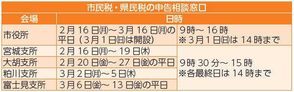 市民税・県民税の申告相談窓口を右表のとおり開設します。申告会場は混雑します。後日案内する郵送や電子申告を利用してください。その他の市民サービスセンター出張会場は、二次元コード(本紙参照)のホームページをご覧ください。