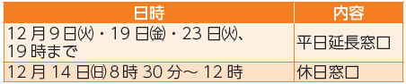 下表のとおり平日延長・休日窓口を開設します。カード作成の申請とマイタクの手続きはできません。また、平日窓口も含め時間帯での予約も可能。二次元コードのホームページから予約してください。なお、混雑状況により受付時間内でも締め切る場合があります。