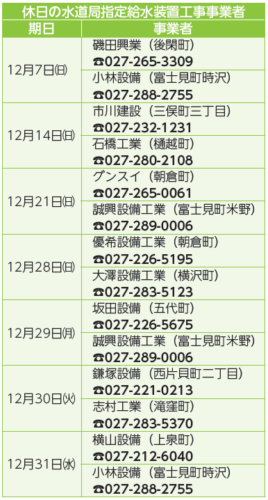 休日の指定工事事業者は左表のとおりです。なお、給水管1次側(水道メーターより道路側)で発生した自然漏水(故意や過失ではない、通常の使用で発生した漏水)に限り水道局が修理します。給水管は個人所有物です。私有地内は宅地内修繕依頼書の説明に沿って協議します。掘削などを伴う工事や私有地内での解体工事などで折損した場合は該当しません。