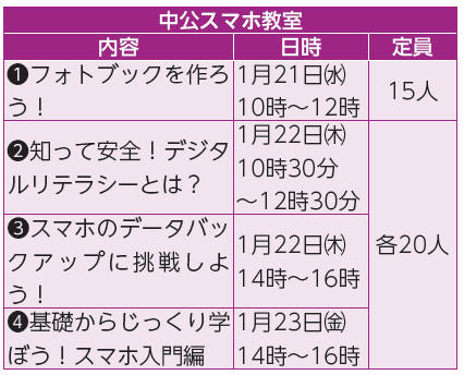 申し込み:12月22日(月)(必着)までにハガキで。郵便番号・住所・氏名・電話番号・希望のコース((1)〜(4)のいずれか)を記入し、〒371-0023 本町二丁目12-1・中央公民館「中公スマホ教室(1月分)係」へ
