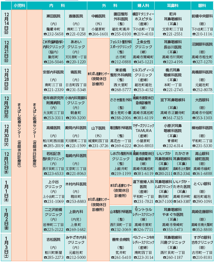 ※12月21日・29日・31日・1月2日の婦人科は12時まで。13時から18時までは産科婦人科舘出張佐藤病院(高崎市若松町【電話】027-322-2243)で診療。
