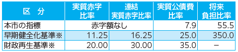 いずれの指標も早期健全化などを求められる基準を下回り、健全な状態です。今後も一層の財政健全化を図ります。