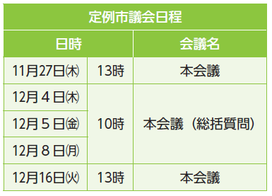 第4回定例市議会の日程は右表のとおりです。インターネットで生中継します。スマホやタブレット端末などからも視聴できます。詳しくは市議会ホームページをご覧ください。