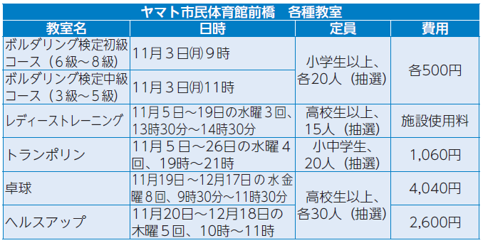 申込み:10月15日(水)までにまえばしスポーツナビで。または往復ハガキ(必着)で(1人1通)。教室名・郵便番号・住所・氏名(ふりがな)・生年月日(西暦)・電話番号を記入し、〒371-0816 上佐鳥町460-7・ヤマト市民体育館前橋へ