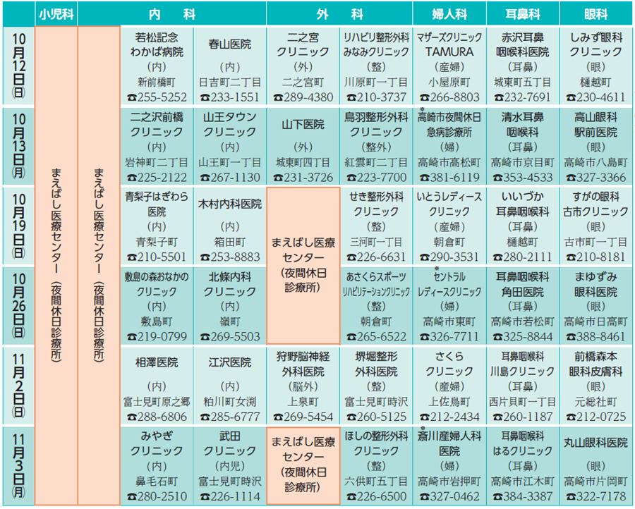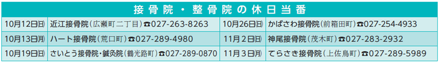 ※10月13日・26日・11月3日の婦人科は12時まで。13時から18時までは産科婦人科舘出張佐藤病院(高崎市若松町【電話】027-322-2243)で診療。