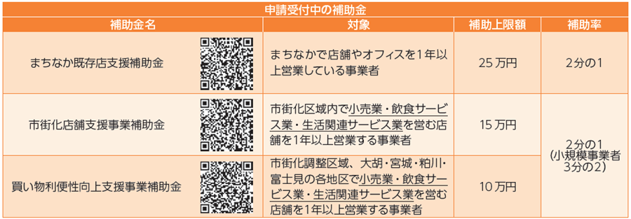 下表のとおり、市内の事業者向けに区域・業種・事業内容に応じた補助制度を実施。補助の対象は内容や業種によって異なります。工事着手前に申請してください。内容により金額が一部異なる場合があります。詳しくは問い合わせてください。