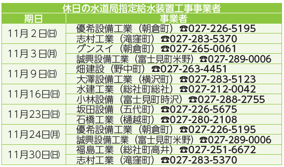 水道管は早めの防寒対策で破裂やひび割れを防いでください。凍らないために水道管や蛇口に毛布や布などの保温材を巻き付け、ひもやテープで押さえます。布や発泡スチロールなどを詰めたビニール袋をメーターボックスに入れることも有効。検針できるようにメーターの上面は空けておいてください。破裂して水が噴出したらメーターボックス内の止水栓を閉めて、破裂した部分に布やテープを巻き応急処置を。最寄りの指定給水装置工事事業者へ修理を依頼してください。凍って水が出ないときは自然に溶けるのを待つか、タオルをかぶせてゆっくりとぬるま湯をかけます。熱湯を直接かけると水道管が破裂する危険があります。なお、休日の指定事業者は上表のとおりです。