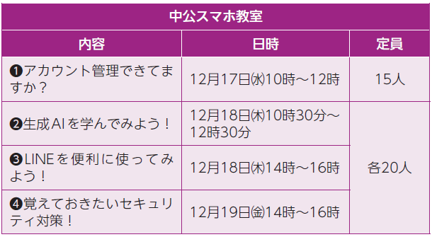 申し込み:11月25日(火)(必着)までにハガキで。郵便番号・住所・氏名・電話番号・希望のコース((1)〜(4)のいずれか)を記入し、〒371-0023 本町二丁目12-1・中央公民館「中公スマホ教室(12月分)係」へ