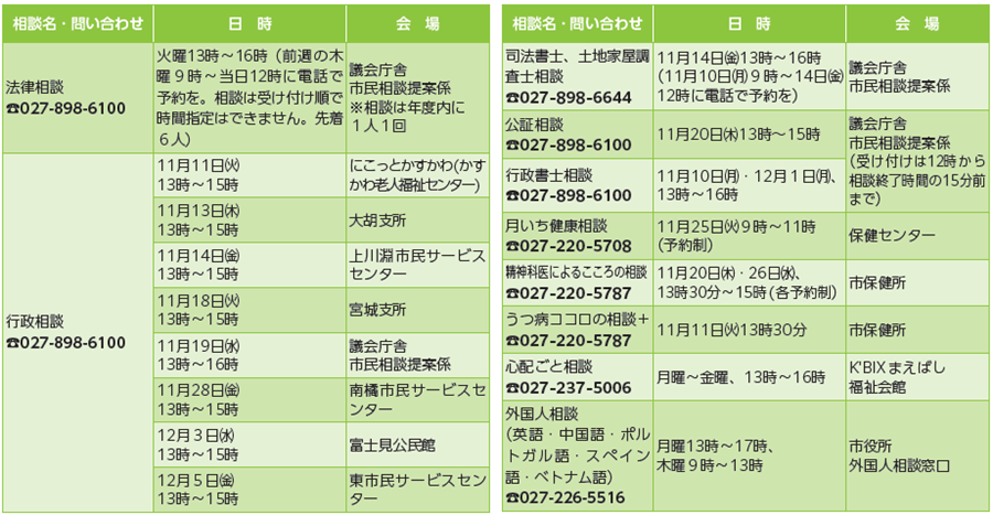 ※市民相談(【電話】027-898-6100)は平日の9時~17時。家庭児童相談(【電話】027-223-4148)、母子・父子相談(【電話】027-220-5701)、DV相談(【電話】027-898-6524)、男女共同参画相談(【電話】027-898-6520)、就学に向けての相談(【電話】027-210-1234)、消費生活・多重債務相談(【電話】027-898-1755)は平日の9時~17時。教育・青少年相談(【電話】027-230-9090)は平日の10時~17時。自殺予防「群馬いのちの電話」(【電話】027-212-0783)は9時~24時。みんなの人権110番(【電話】0570-003-110)は平日の8時30分~17時15分。