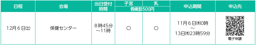 下表のとおり、子宮頸(けい)がん・乳がんの集団検診を実施します。全ての検診で事前の申し込みが必要です(先着順・定員あり)。こどもを連れて受診する人は予約時に相談してください。