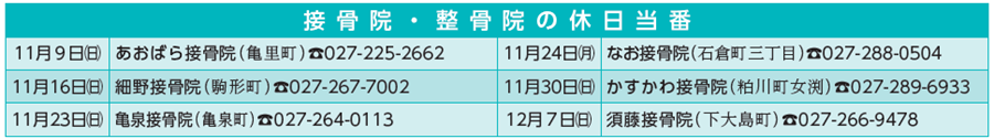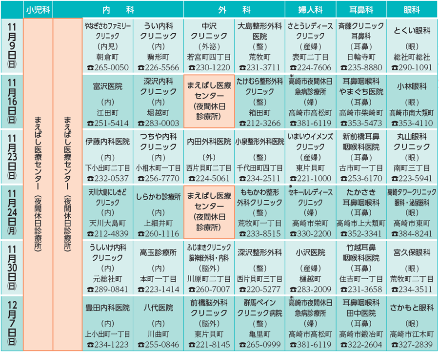 ※11月16日・24日・12月7日の婦人科は12時まで。13時から18時までは産科婦人科舘出張佐藤病院(高崎市若松町【電話】027-322-2243)で診療。