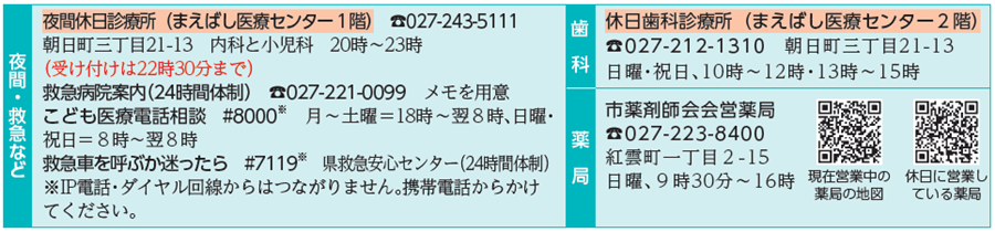 ・まえばし医療センター(夜間休日診療所)の受け付けは、9時から11時30分、13時30分から15時30分までです。また、受診の際はマスクの着用をお願いします。