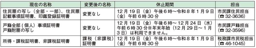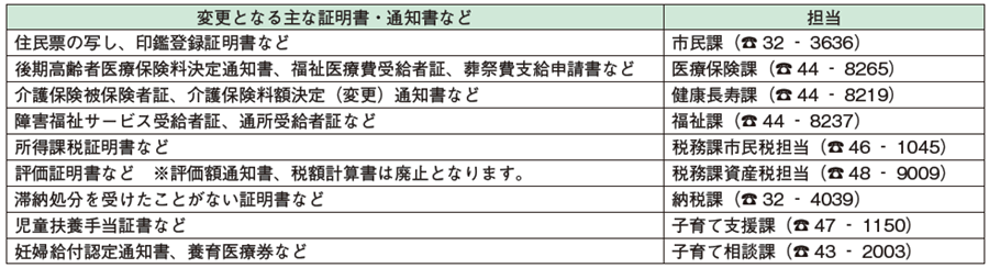 全国の自治体が進めている「自治体情報システムの標準化・共通化」に伴い、市で使用している基幹システムを新システムへ移行するため、12月22日(月)より市が発行する下表の証明書・通知書などの様式が変更となります。
