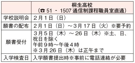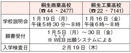 桐生商業高校と桐生工業高校の定時制課程、桐生高校の通信制課程の学校説明会と入学者選抜を実施します。なお、定時制課程では募集定員に満たない場合に再募集や追加募集が行われることがあります。