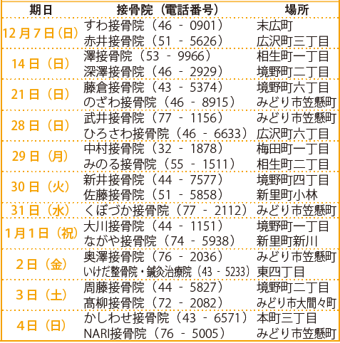 くらし 休日当番接骨院 45/50 前の記事 次の記事 発行日 : 2025年12月01日 自治体名 : 群馬県桐生市 広報紙名 : 広報きりゅう 令和7年12月号 時間:午前9時~午後3時 ※接骨院により時間を延長する場合があります。 ※受診の際は各病医院などに事前にお問い合わせください。休日当番医・接骨院・薬局は変更になる場合があります。 ※昼の休診時間などは医院・接骨院・薬局により異なる場合があります。 Tweet シェアする 休日当番薬局 休日緊急歯科診療所
