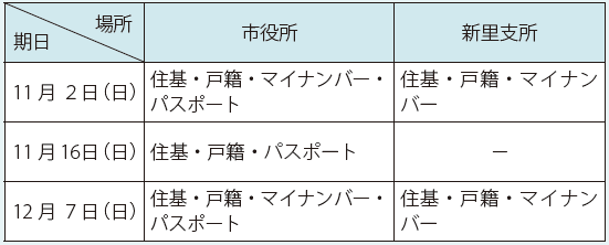 くらし 市役所・支所業務時間 35/43 前の記事 次の記事 発行日 : 2025年11月01日 自治体名 : 群馬県桐生市 広報紙名 : 広報きりゅう 令和7年11月号 時間:午前8時30分~午後5時15分 休業日:土、日、祝日、年末年始 ※住基・戸籍(一部業務を除く)は、市役所は水曜日のみ午後7時まで ※パスポート…午前9時~午後4時30分 ※マイナンバー…午前9時~午後5時15分(市役所は、水曜日のみ午後7時まで) ◆休日窓口 時間:午前9時~午後1時 住基:住民基本台帳 問い合わせ:市民課 【電話】32-3596【電話】32-3636 Tweet シェアする くらしの便利ガイド 休日当番医