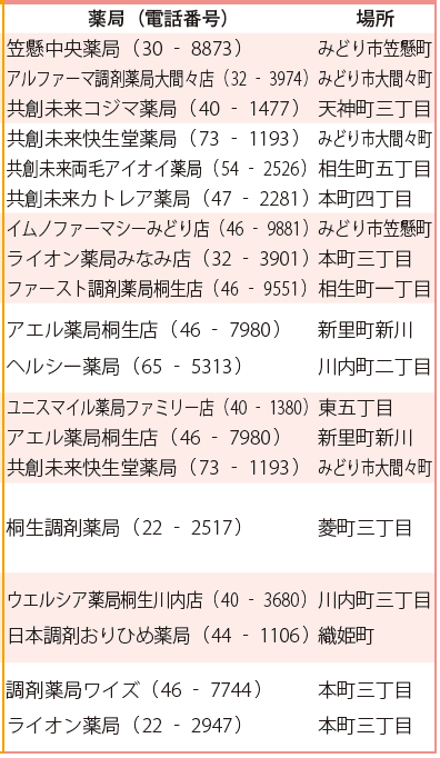 くらし 休日当番薬局 37/43 前の記事 次の記事 発行日 : 2025年11月01日 自治体名 : 群馬県桐生市 広報紙名 : 広報きりゅう 令和7年11月号 時間:午前9時~午後6時 ※受診の際は各病医院などに事前にお問い合わせください。休日当番医・接骨院・薬局は変更になる場合があります。 ※昼の休診時間などは医院・接骨院・薬局により異なる場合があります。 Tweet シェアする 休日当番医 休日当番接骨院