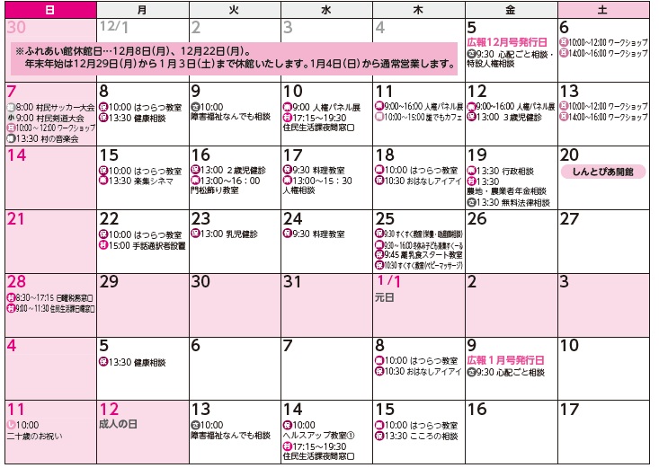 実施場所:(村)村役場、(保)保健相談センター、(さ)ささえの家、(し)しんとぴあ、(南)南部コミセン、(ふ)ふれあい館、(耳)耳飾り館、(ア)しんとうスポーツアリーナ、(楽)楽集センター、(総)総合グラウンド、(公)ふるさと公園、(小)南小体育館 、(榛)榛東中体育館