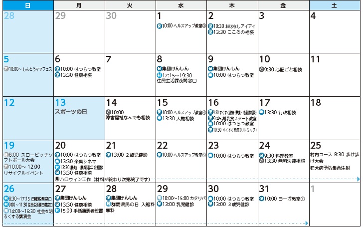 実施場所:(村)村役場、(保)保健相談センター、(さ)ささえの家、(中)中央公民館、(南)南部コミセン、(ふ)ふれあい館、(耳)耳飾り館、(児)児童館、(ア)しんとうスポーツアリーナ、(楽)楽集センター、(総)総合グラウンド、(公)ふるさと公園、(榛)榛東中体育館
