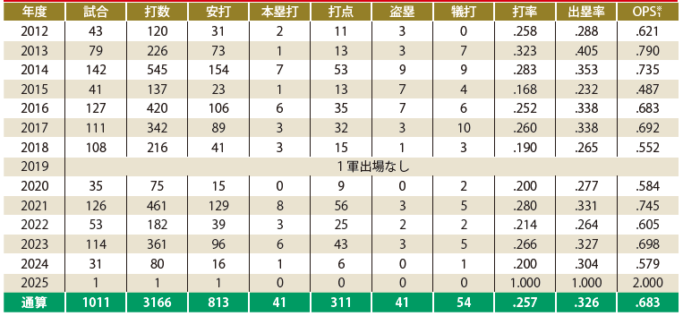 2025年 10月4日現役引退。通算1011試合出場、3583打席 362得点 813安打 41本塁打 打点311 盗塁41 打率257
