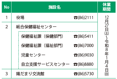 ※休業期間中、役場には午前8時30分から午後9時まで当直はいますが、納税などの限られた業務しか対応できませんので、ご注意ください。