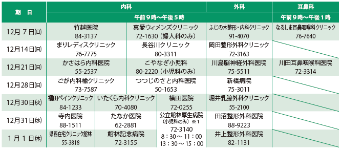 ※祝休日は公立館林厚生病院(【電話】72-3140)も担当しています。(急患の内科・外科)