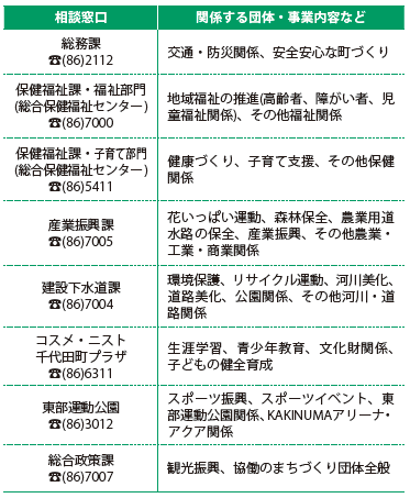 応募方法:活動内容について、まずは事業に関連する役場所管課(右表参照)へご相談ください。