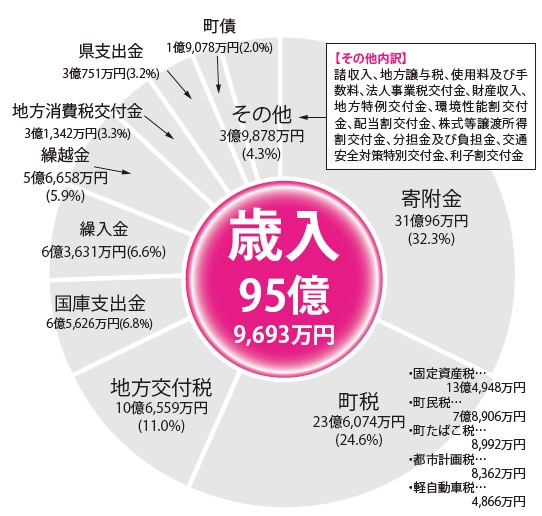 一般会計の歳入は、総額95億9,693万円となり、前年度と比べ6億2,671万円の増額となりました。