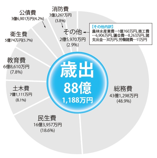一般会計の歳出は、総額88億1,188万円となり、前年度と比べ4億824万円の増額となりました。