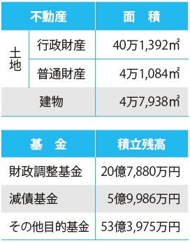 町有財産には、使用目的が限定されている土地などの「行政財産」や、法令に基づき積み立てている「基金」などがあります。