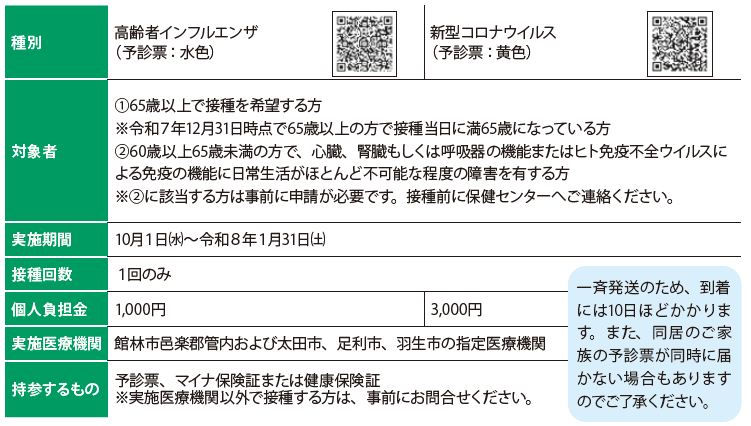 町では、インフルエンザおよび新型コロナウイルス予防接種費用を一部負担します。接種を希望する方は、ワクチンの効果や副反応を理解した上で接種をしてください。